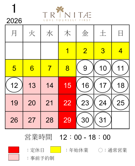 2026年1月の営業日は以下のとおりです。